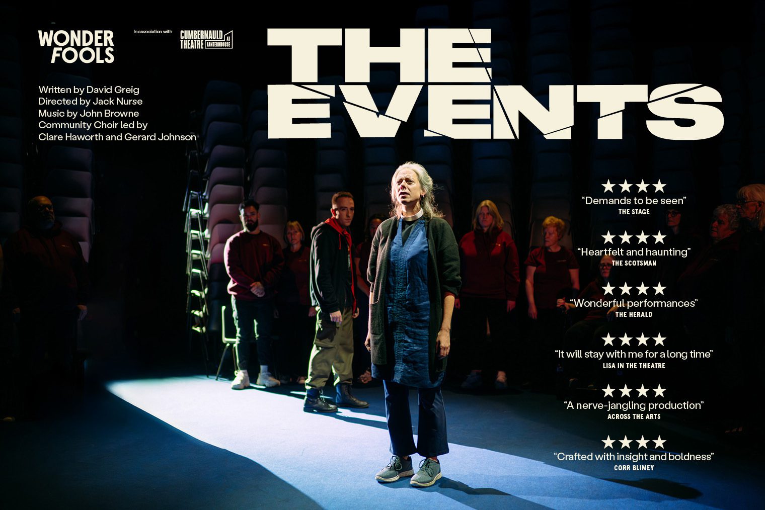 When Claire, a priest and choir leader, survives a mass shooting in her church, she embarks on a desperate search for answers that will ultimately bring her face to face with the attacker. David Greig’s modern classic returns in a bold new staging by Wonder Fools (Òran, 549: Scots of the Spanish Civil War) in association with Cumbernauld Theatre. Featuring a live community choir, every performance becomes unique – powerful, uplifting, and rooted in the place where it is staged.