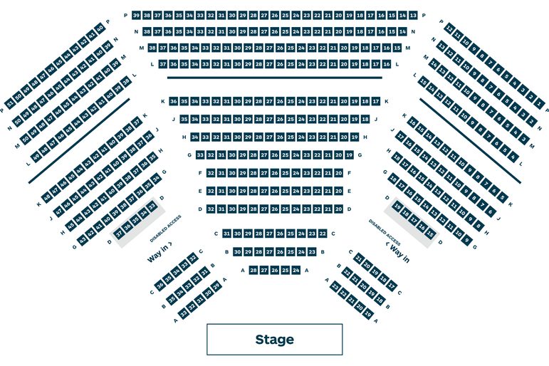 Most of the seating in the auditorium is reached by stairs. There is a hand rail between rows D and G, and elsewhere there are handhold grips at the end of each row. The auditorium is entered at row D. There are 28 steps up to row P which is the back row of the auditorium. There are 3 steps down to row A. There is no lift access in the auditorium. Seats in the auditorium are approximately 40cm wide. We have accessible seating inside the auditorium, seats D15-19 and D33-37 on the seating plan. These seats fold down (and can therefore be used by those who find steps difficult) or folded up to allow space for a wheelchair.